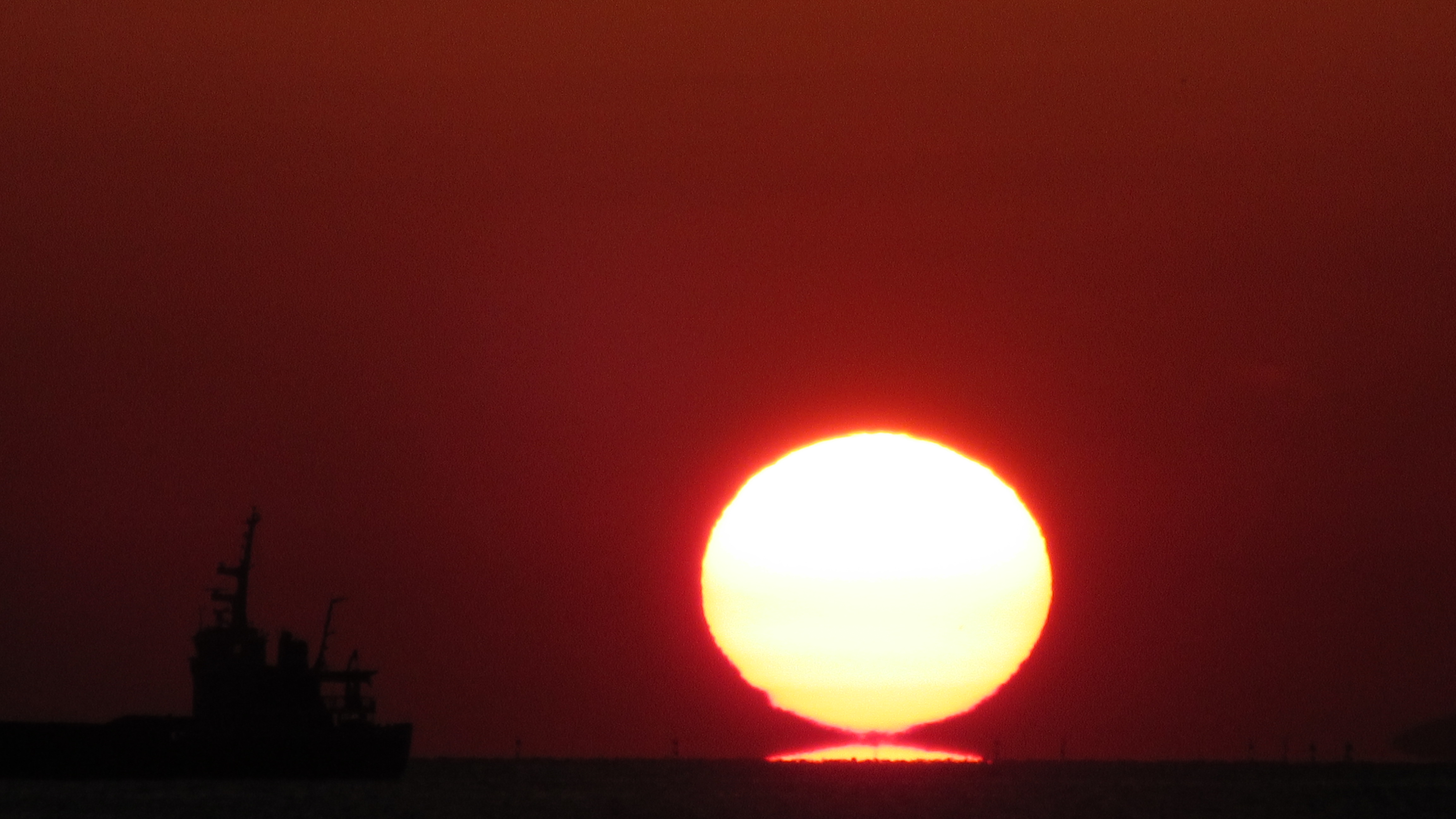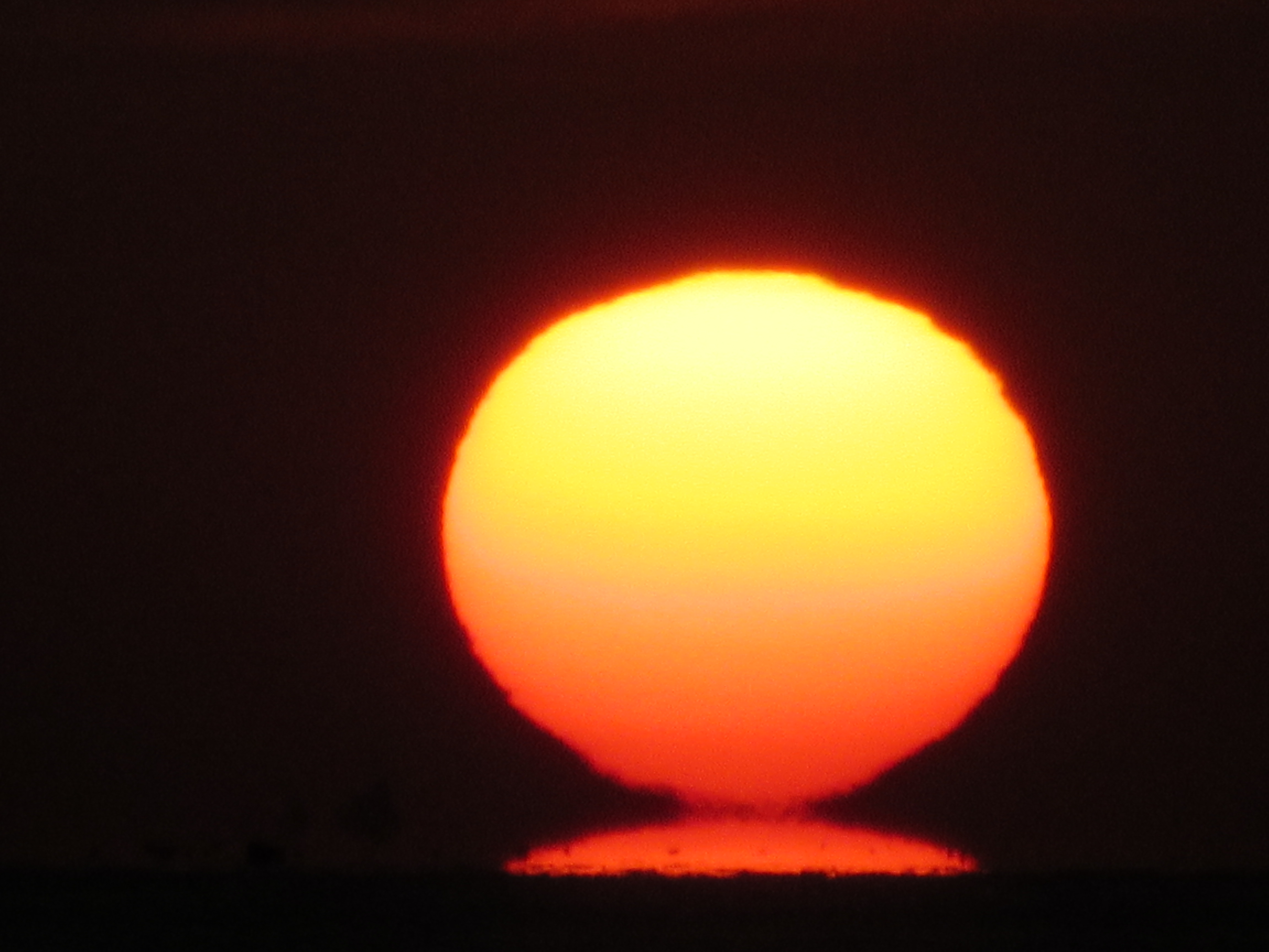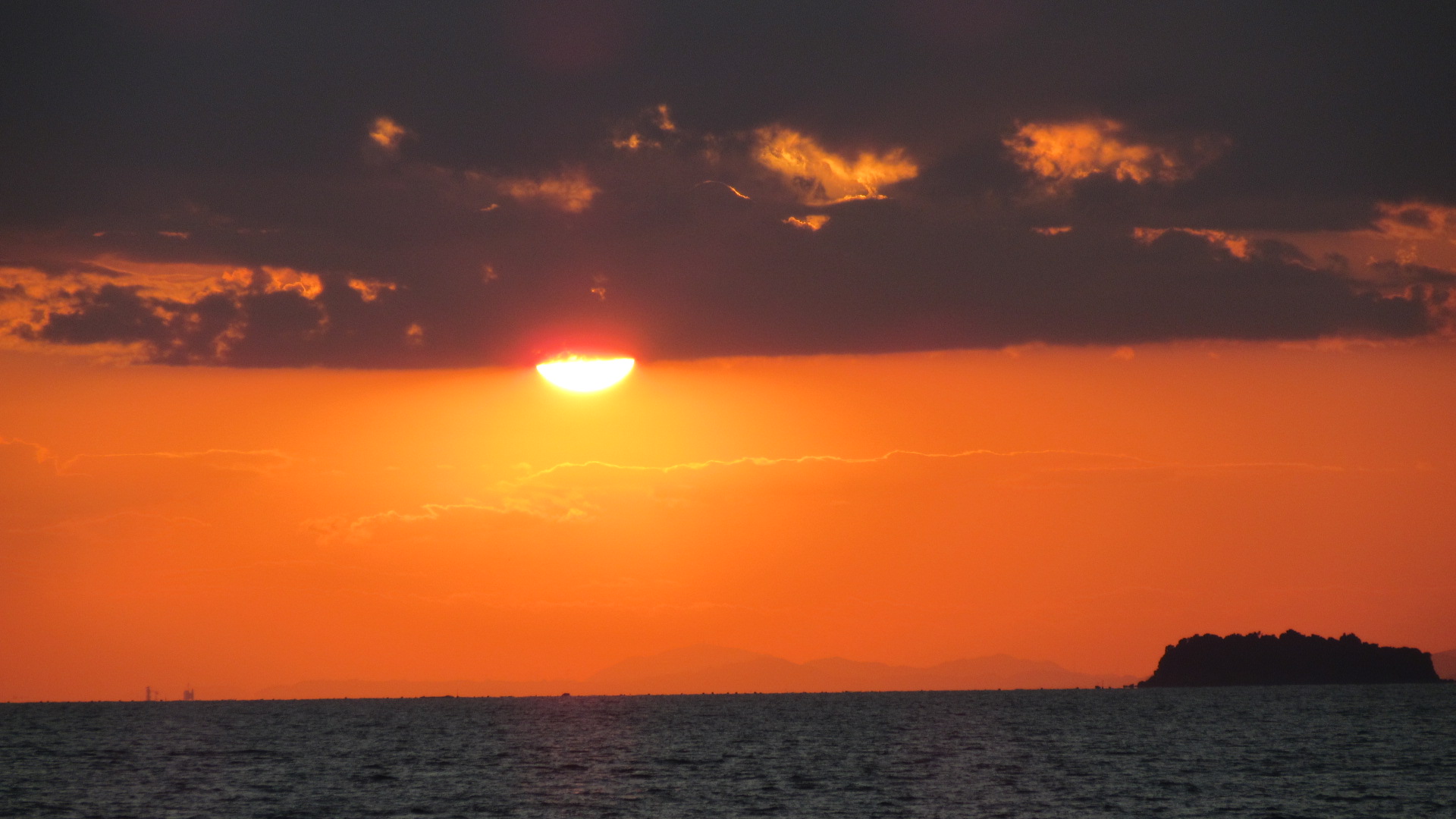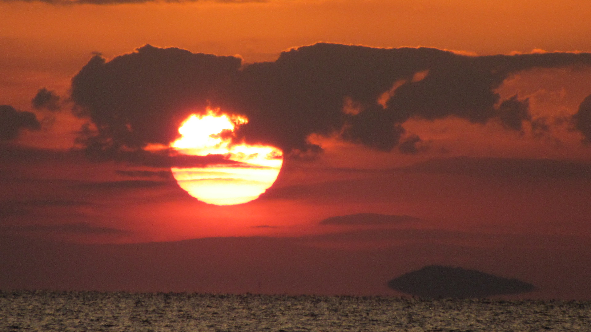 それでも通い詰めればこんな『だるま夕陽』もグラデーション夕陽水平線に付いた瞬間です