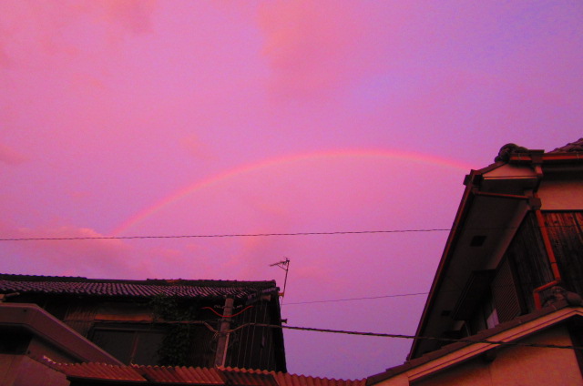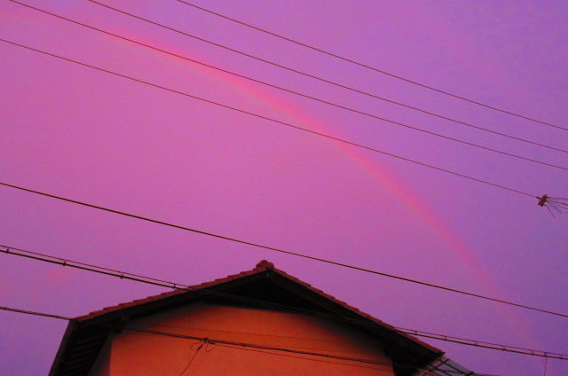 四季 2016/06/30 『雨上がりの虹』のように (^^)/~~~ 梅雨の雨が上がり、西の山並みに今まさに夕陽が沈みかけた一瞬に虹が出ました。もっと出ていてほしいのですが、儚いから美しいのでしょうね(^^)/~~~
