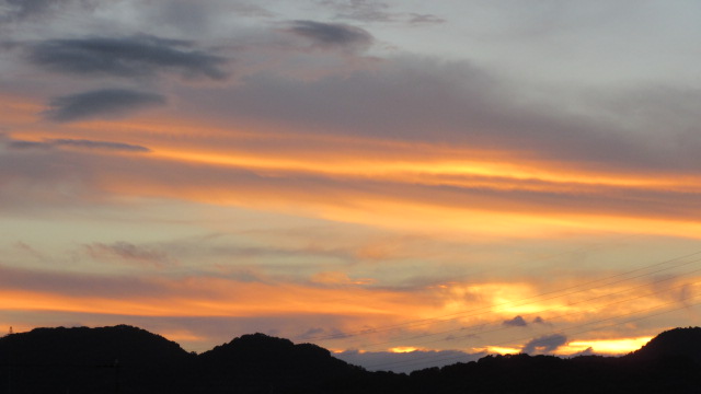 四季 2016/08/20 夕景と朝景 なかなか綺麗な夕景に巡り会えない。たいていがカメラを持ち合わせていない時に限って、一年に数回しか観られないような素晴らしいものがある。自分の運のなさにガッカリするが、目に焼き付け次回を楽しみにしている。 そんな中の一日、日毎日没時間が早くなる。気がつけばもうすっかり陽が沈み、黒い雲が漂ってたりする。数日前の久々の素晴らしい夕景。これからという時にカメラの電池切れ。何とも不甲斐ない自分に、腹立たしくなるが夕景を眺めていて気も安らぐ。 夕景の華やかさに比べ、朝焼けってこんなものなんだろうか。若かりし頃一晩中飲み明かした頃は、もっと鮮やかだった気がした。あれは酔いのための幻か、それとも感じる心があったのか。