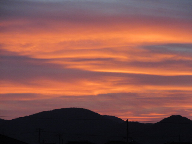 | 8月2日。 雲が全くない日々の連続です。 夕焼けを諦め、『夕陽』に路線変更です。 これね中々いいですね(^_-)-☆ | 西の山が燃えるかの夕陽の輝きです。 事実毎日灼熱の日々が続いています。 とうとう山まで燃える、、、のかと(^_-)-☆ |
