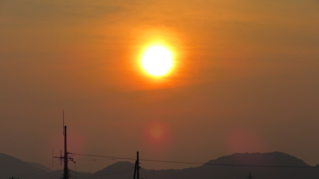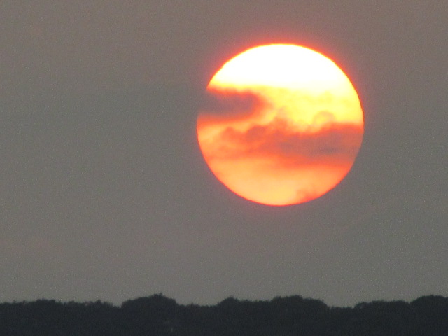 | 7月29日。 この日もほぼ快晴。 薄雲越しに沈みかけの夕陽ですが、 これはこれで綺麗ですね。 | 7月31日の夕陽。 ぼんやりと霞んでいます。 満月かと思うような、夕陽です。 |